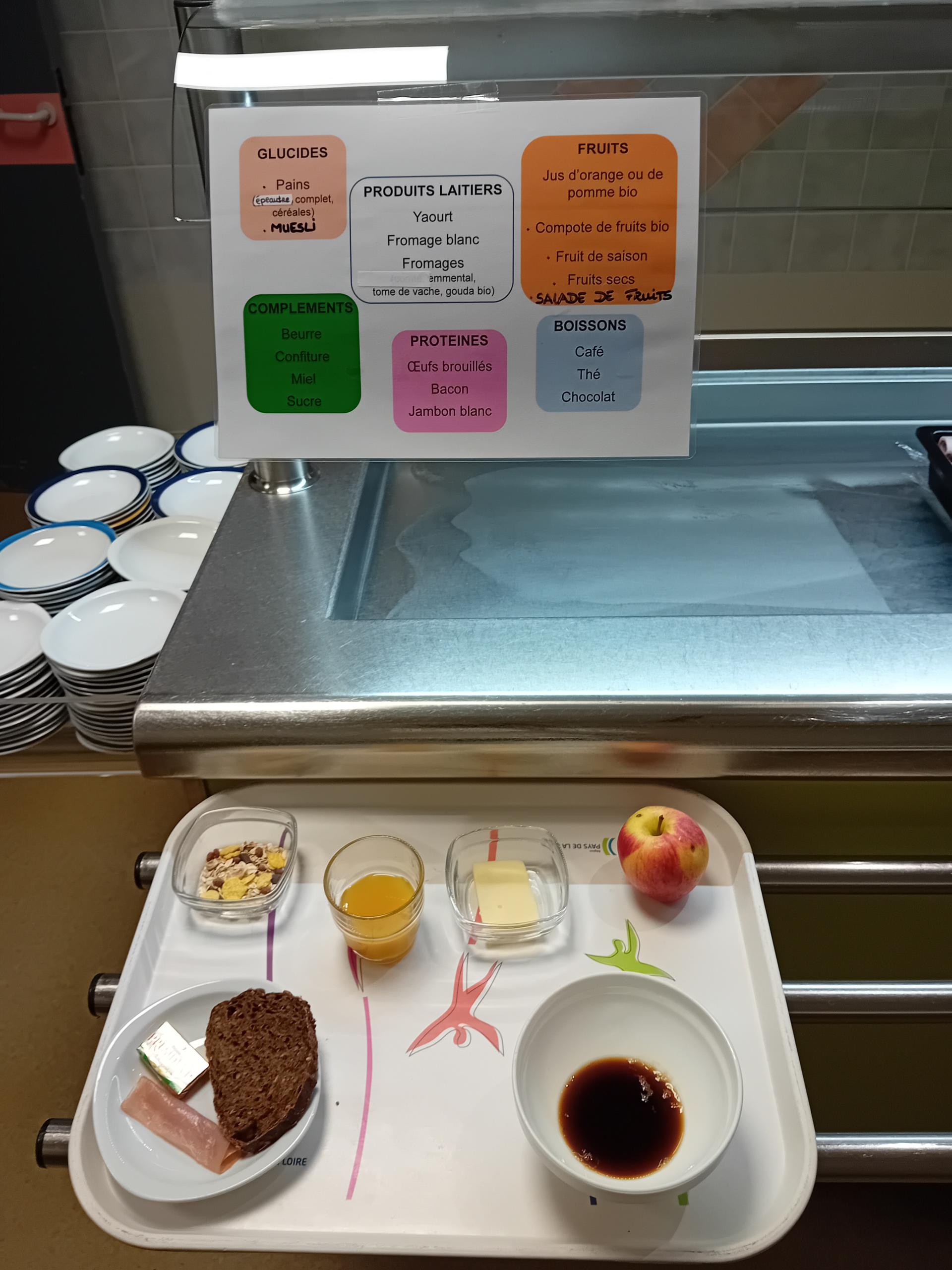 Jus d’orange ou jus de pomme bio, salade de fruits, fruits de saison, fruits secs, compote